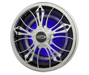Motorized and backlit blue illumination 12 volt subwoofer grills rotate clockwise or counter-clockwise. Lights make woffer cones glow blue. Metal mounting ring fits most conventional 12" subwoofers.